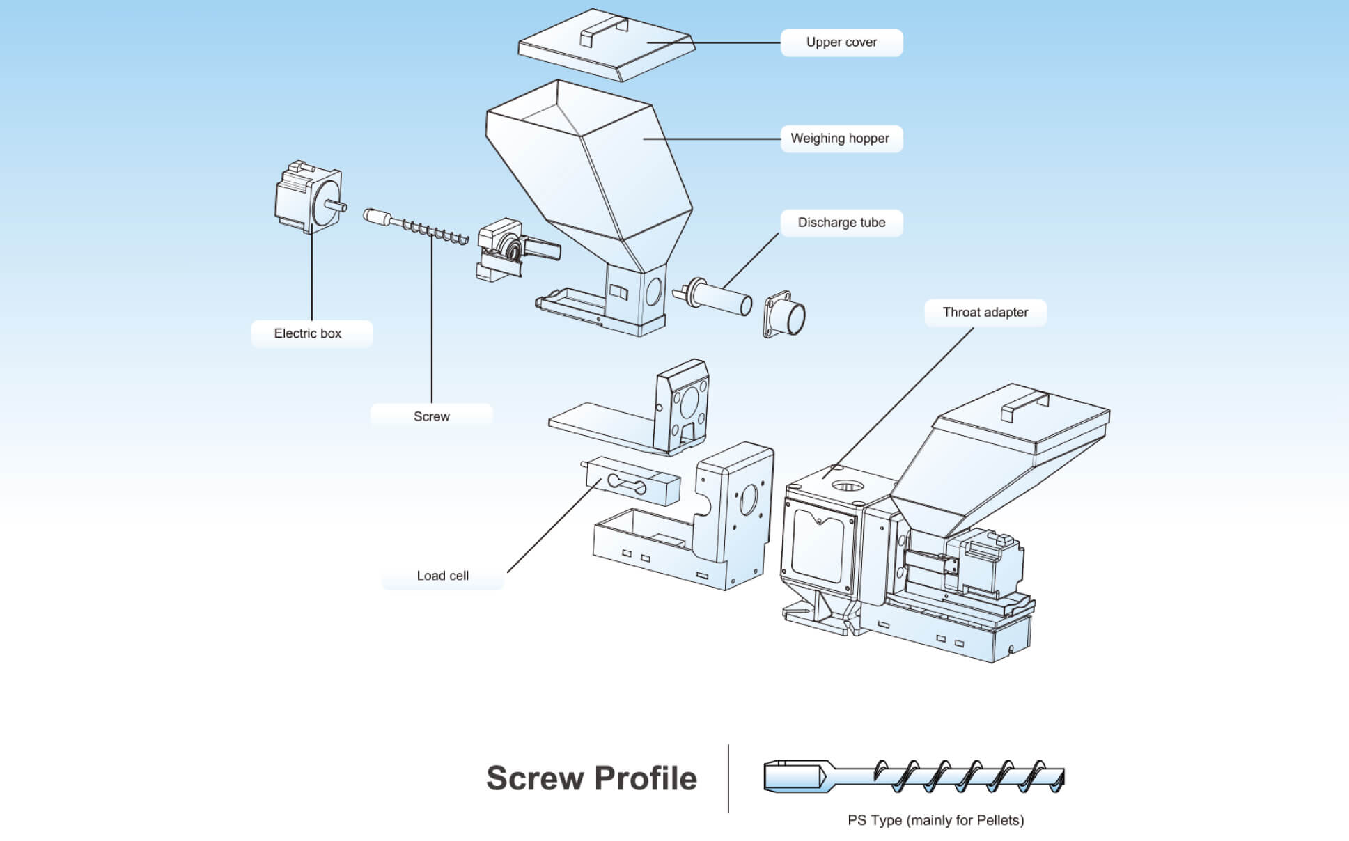 - The replacement of the masterbatch and feeding screw can be completed in 60 seconds.