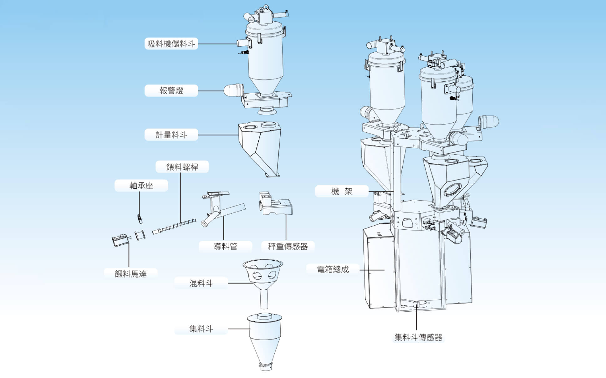 多組份混料式失重秤專為配方需求以及高精度顆粒餵料做設計。根據不同的配方需求,可以選擇不同料斗的組合數。此機台不僅擁有美觀的外貌,也易於安裝及維護。