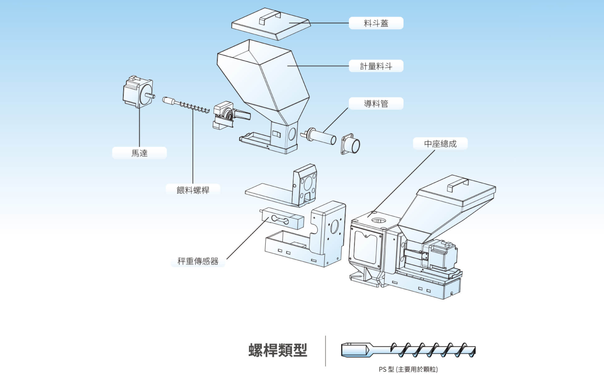 色料機是我們模組化配料解決方案的一部分。 它以經濟實惠的價格滿足了對精密配料裝置的需求。 它配備了高品質的步進馬達、多種配料缸和螺桿、不銹鋼料斗和堅固的中座總成。